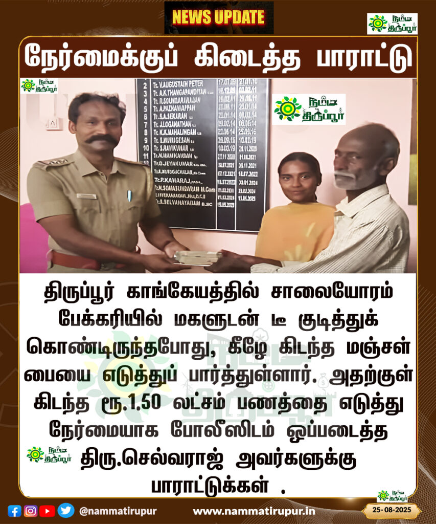 Home/Blog/சாலையோரம் கிடந்த பணத்தை நேர்மையாக போலீஸிடம் ஒப்படைத்த திரு .செல்வராஜ் அவர்களுக்கு பாராட்டுக்கள் . Blog சாலையோரம் கிடந்த பணத்தை நேர்மையாக போலீஸிடம் ஒப்படைத்த திரு .செல்வராஜ் அவர்களுக்கு பாராட்டுக்கள் . srinivasan.infotech Send an email August 28, 20250 24 Less than a minute Facebook Twitter Messenger Messenger WhatsApp Telegram TagsGoldenAct HonestyMatters InspiringStory nammatirupur PoliceIntegrity RoleModel TamilNaduPolice tiruppur Tirupur காங்கயம் காவலர்நேர்மை நேர்மைகாவலர் srinivasan.infotech Send an email August 28, 20250 24 Less than a minute Facebook Twitter Messenger Messenger WhatsApp Telegram Share Facebook Twitter LinkedIn Messenger Messenger WhatsApp Telegram Share via Email